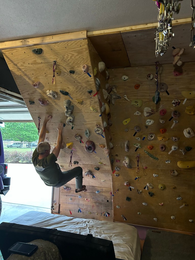 Since we built the wall in the garage in November, I’ve been slowly building my strength back up. If I would compare my strength now to my strength 6 months ago, instead of 20 years ago, I would be much more encouraged instead of being discouraged. Last night, I was able to hold on to and move off of holds that I could only touch 6 months ago.