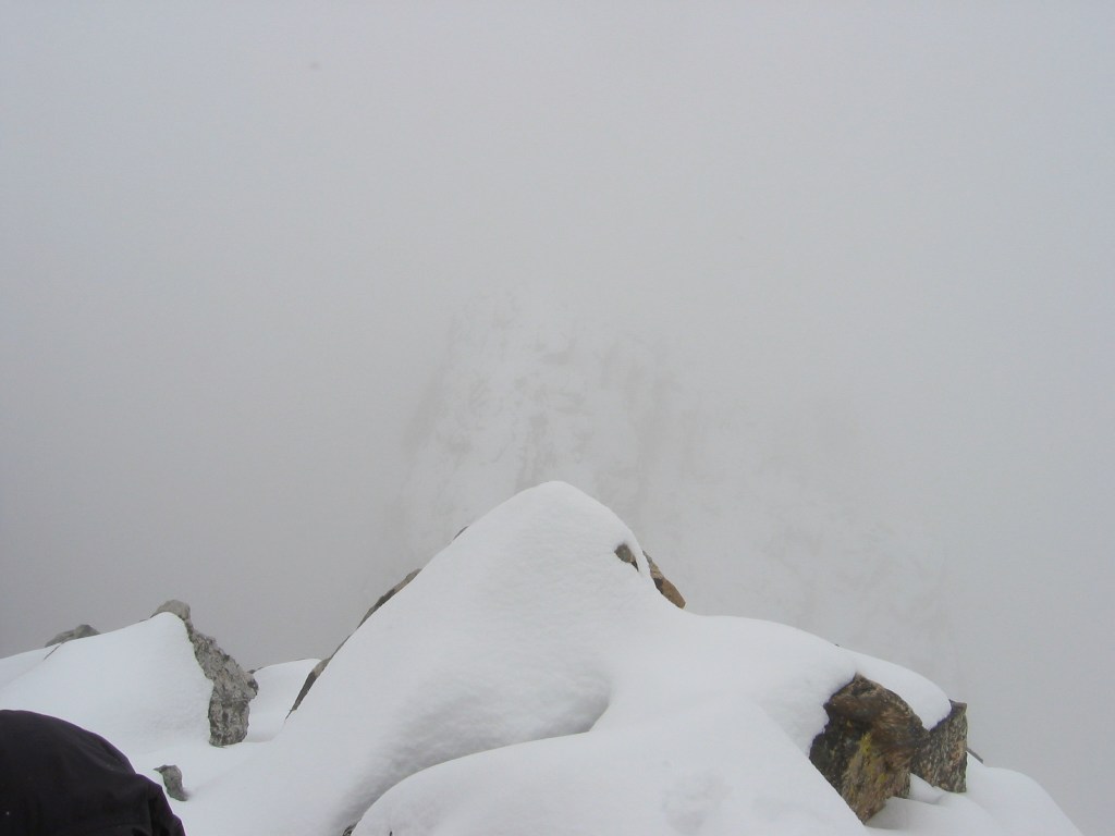 I remember being slightly disappointed that we couldn’t even make out the Grand Teton’s silhouette through the clouds and snow. I sat and ate my lunch with no water because the tube to my hydration bladder had frozen. After 15-20 minutes on the summit, we headed down.