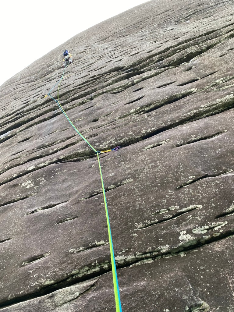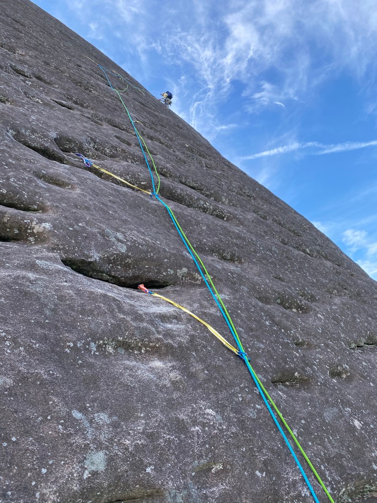 Traditional climbing, or trad climbing is a type of rock climbing where you place gear, or protection as you climb. You place gear in cracks or in other deformities in the rock to protect a fall. Here is the anchor that Maddie built at the top of the third pitch in what we call an “eyebrow.” It consists of three cams equalized with a fourth cam as a backup. It may look scary at 300 feet off the ground, but honestly, you could hang a car from this setup.