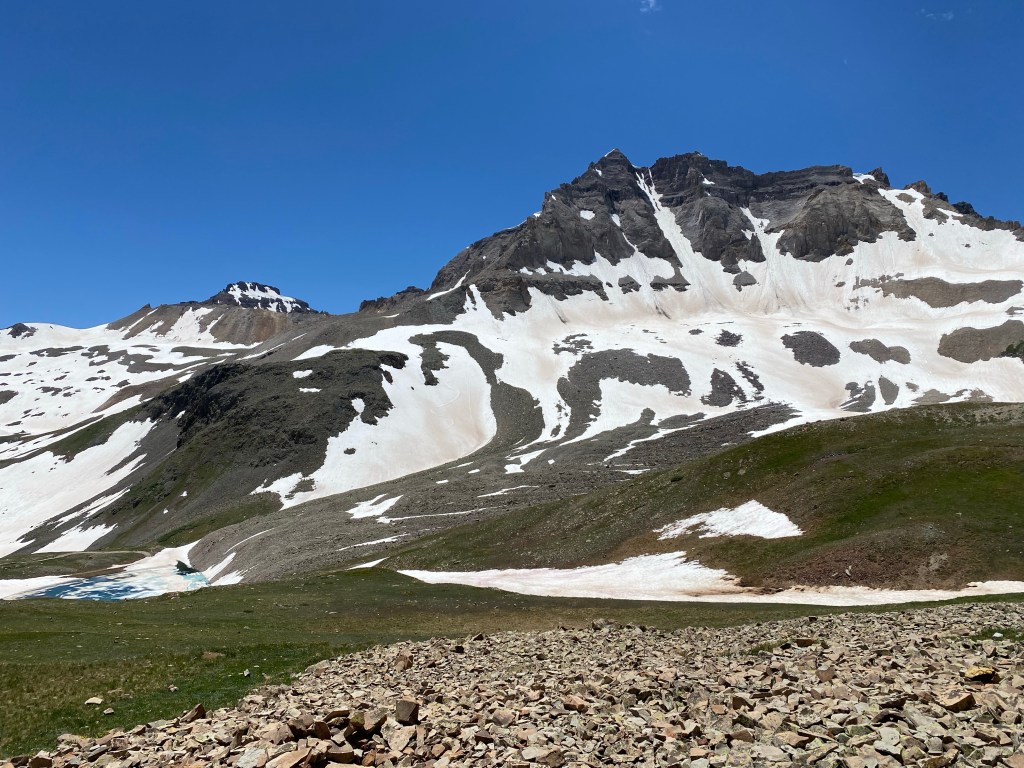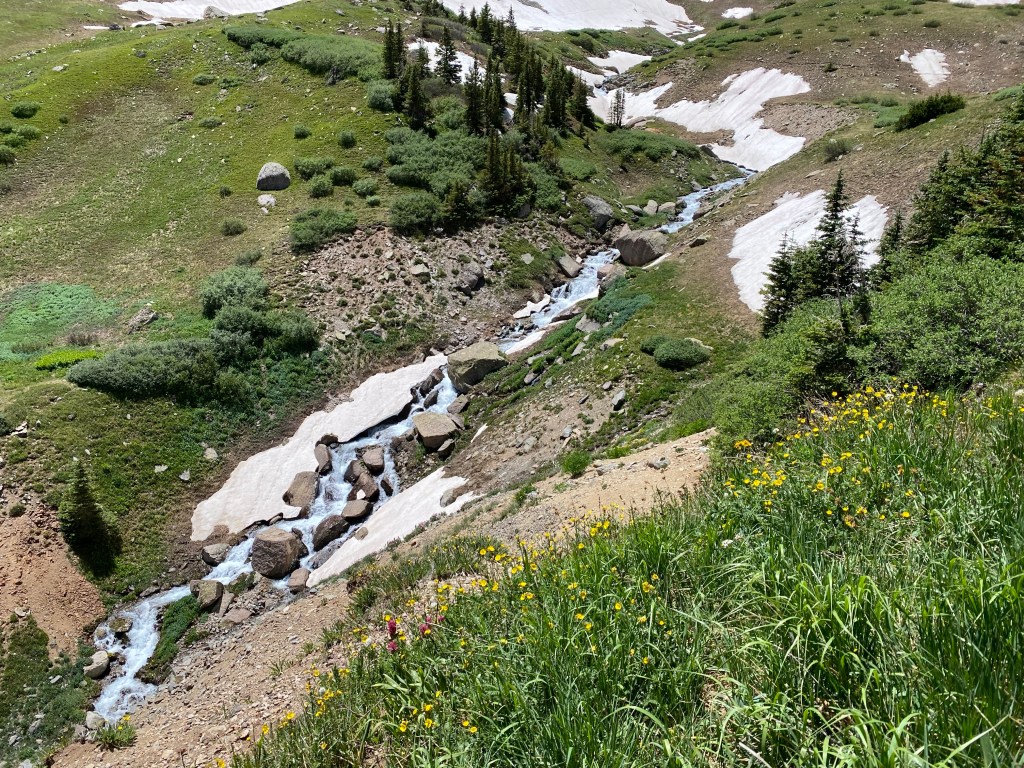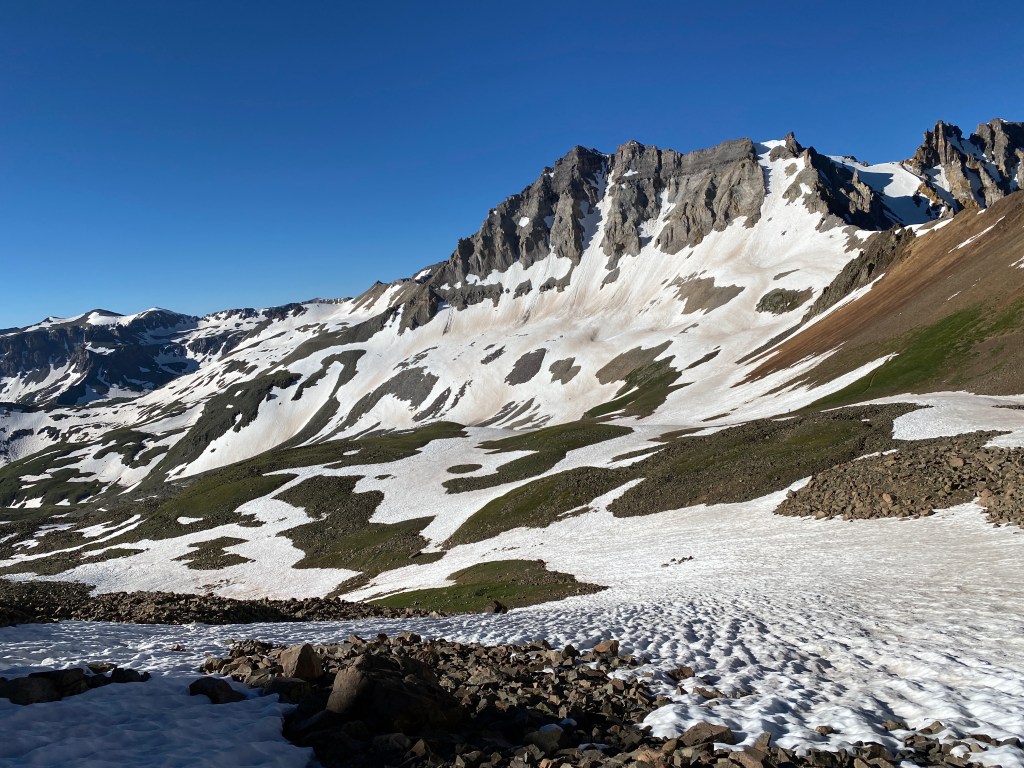 5:15 came early, but we had a big day ahead of us. Mt. Sneffels was on the docket. This is one of the Colorado mountains that is over 14,000 feet above sea level. These are also known as 14ers. We would experience 2900 feet of vertical gain on the hike/scramble. When we arrived at the four-by-four parking area, there were only four vehicles. This was encouraging. I mentioned in an earlier blog that it was a big snow year for several areas out west. The area that we were in is running about three to four weeks behind where they normally are. There is much more snow on the ground than in an average July.