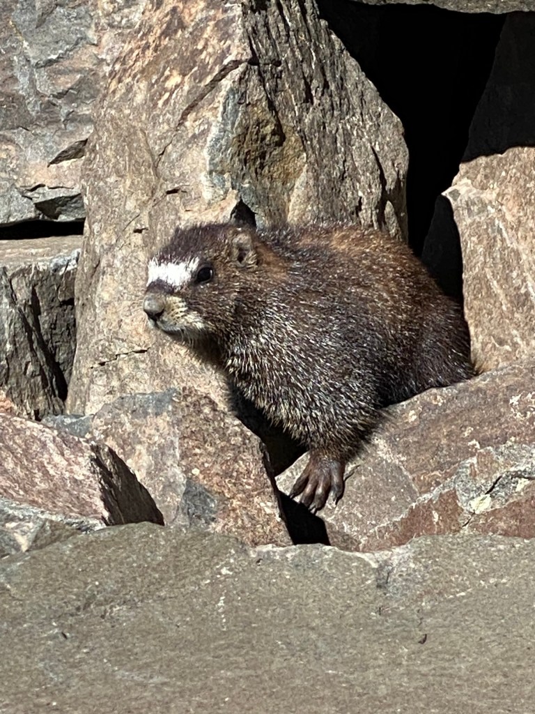 About two-thirds of the way down the talus slope, we met a friend. We saw several marmots on the trip, but this one had a cool white spot on its nose. We called it “Super Sport.”