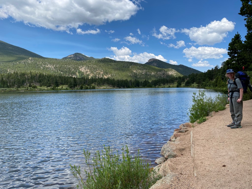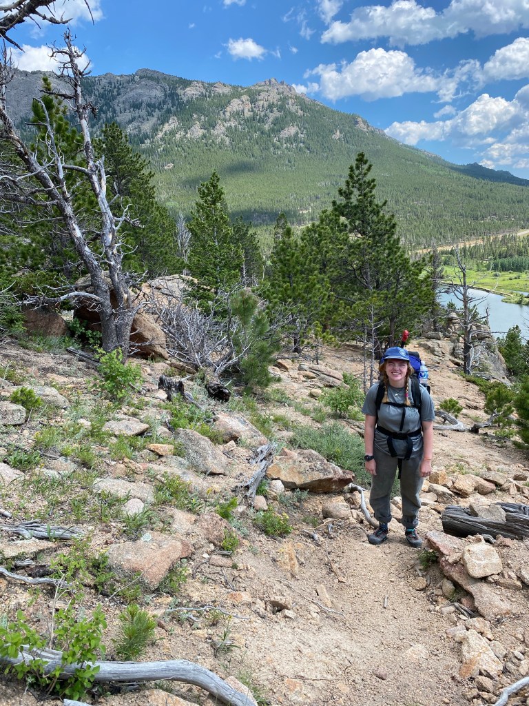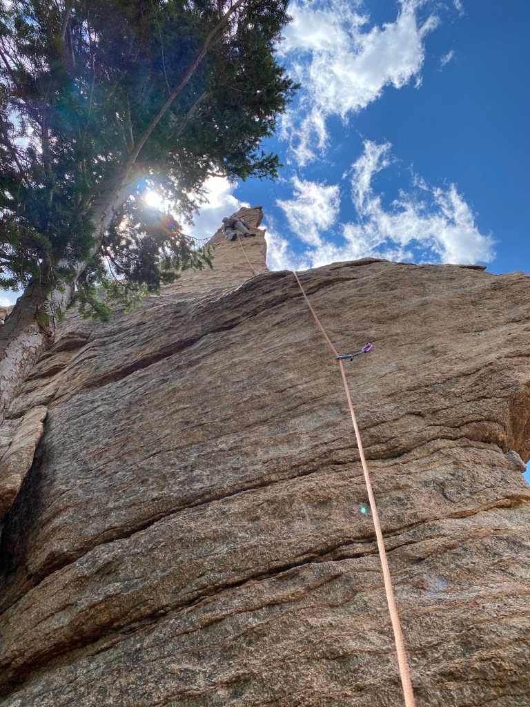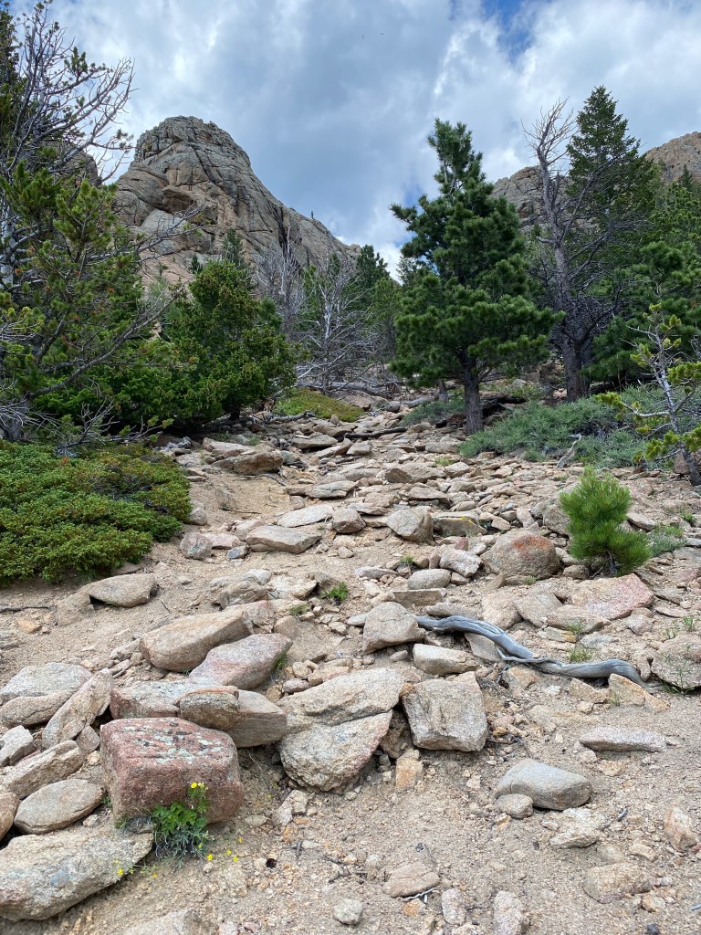 We drove the three-and-half hours to Estes Park to find the trailhead parking area full. It was so full that cars were parked on both sides of the highway for several hundred yards. We were bummed, but there was a climb that Maddie wanted to do. We packed the bags and headed out on the trail. The first half of a mile or so was beautiful and the trail skirted around the pond before heading up the hill. Once we started our ascent, we were wishing that we had given ourselves a recovery day. We inched our way up to the crag with thoughts of waiting in line at an overcrowded climbing area. The temptation to turn around was real, but we pressed on.